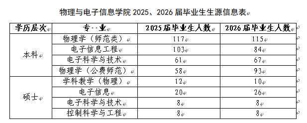 学院2025届本科生层面开设有物理学(师范类)、物理学(公费师范)、电子信息工程、电子科学与技术4个专业;研究生层面开设有学科教学(物理)、电子信息、电子科学与技术、控制科学与工程4个专业。